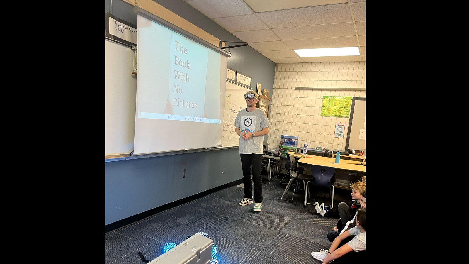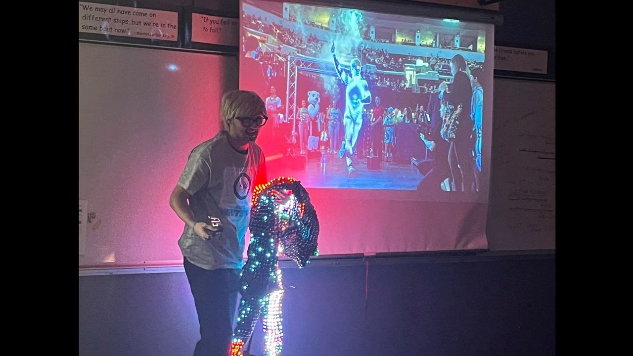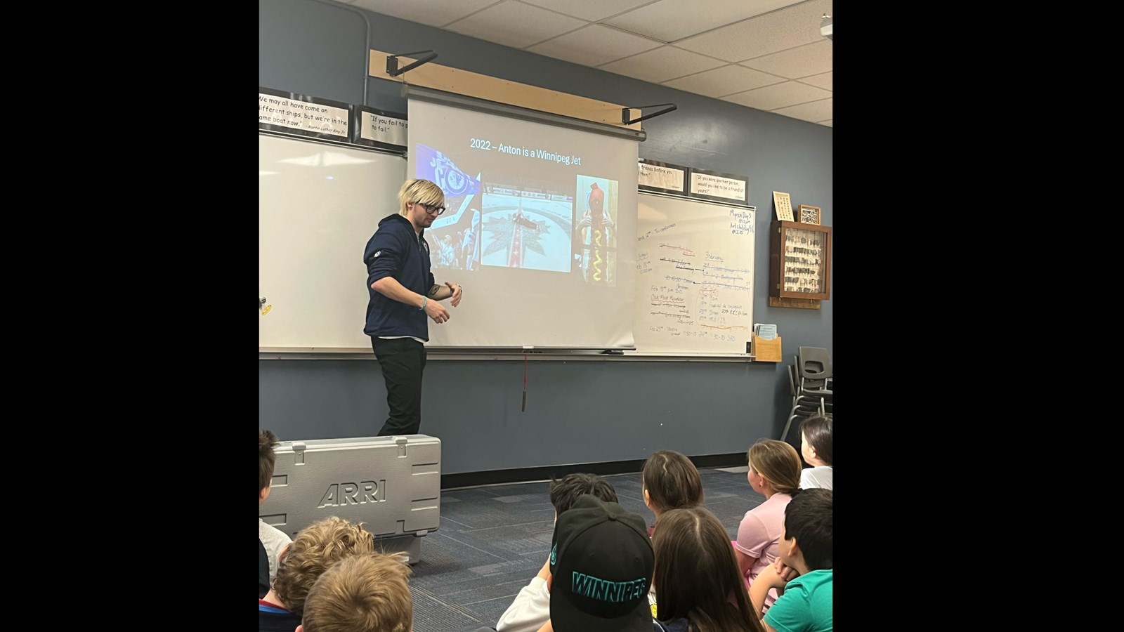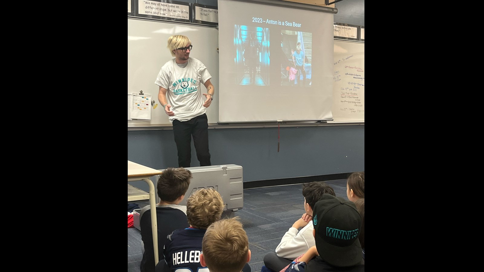 On February 12th the grade four and five classes at River West Park School welcomed Anton Kosyuga to read to them for ‘I Love to Read Month’ and to talk about following their passions—as he did—and what led him to his current role working for the Winnipeg Jets and the Winnipeg Sea Bears through True North as their amazing “hype guy” at the games. He is hard to miss at hockey and basketball games as he is full of energy, moves through the crowds handing out swag and interacting with fans—young and old—and is always dressed in something flashy—like his light up suit he brought to show the students!