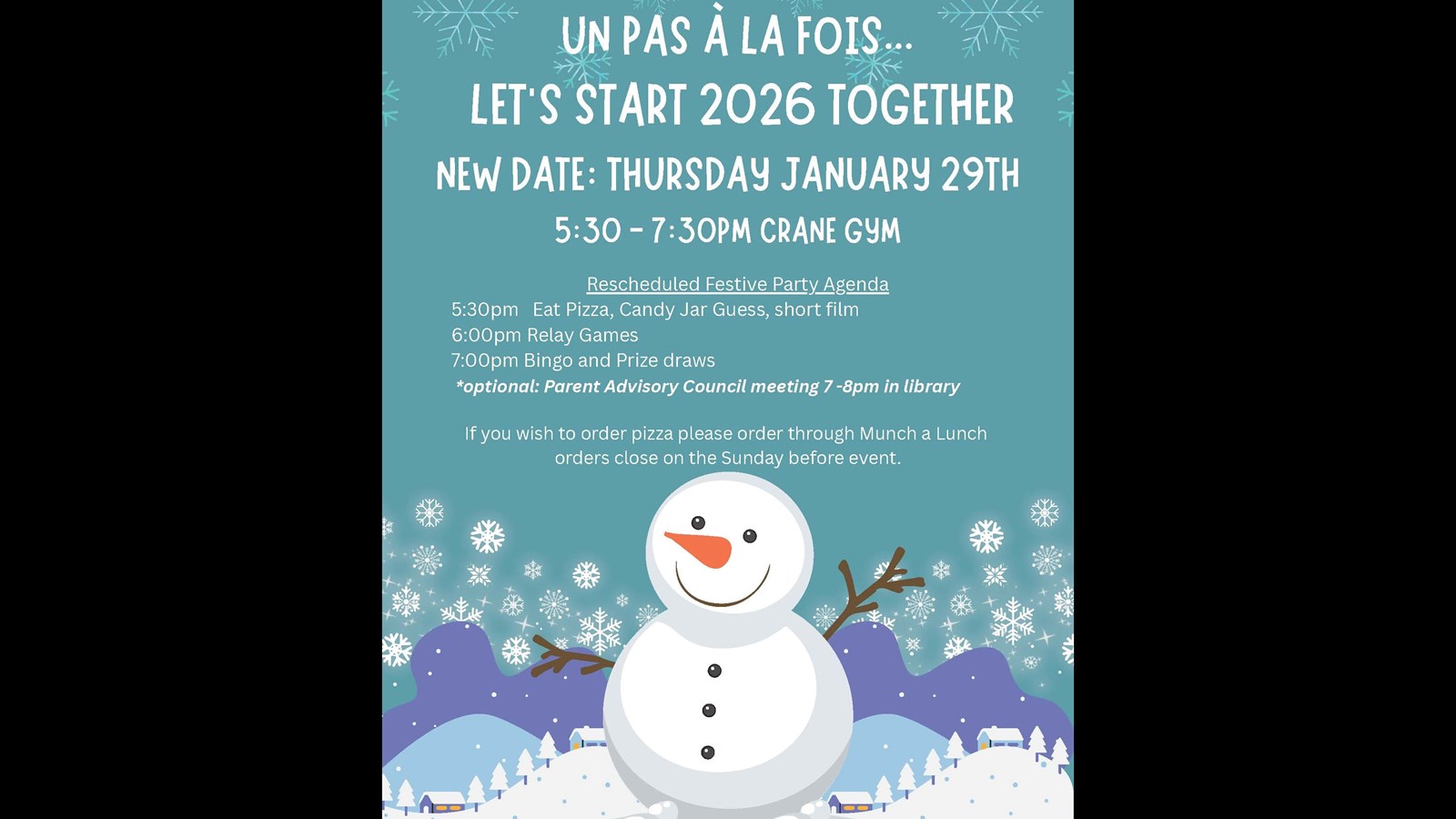 Ecole Crane Parent Advisory Council (P.A.C.) has rescheduled the Festive Party for Thursday January 29th from 5:30pm - 7:30pm.