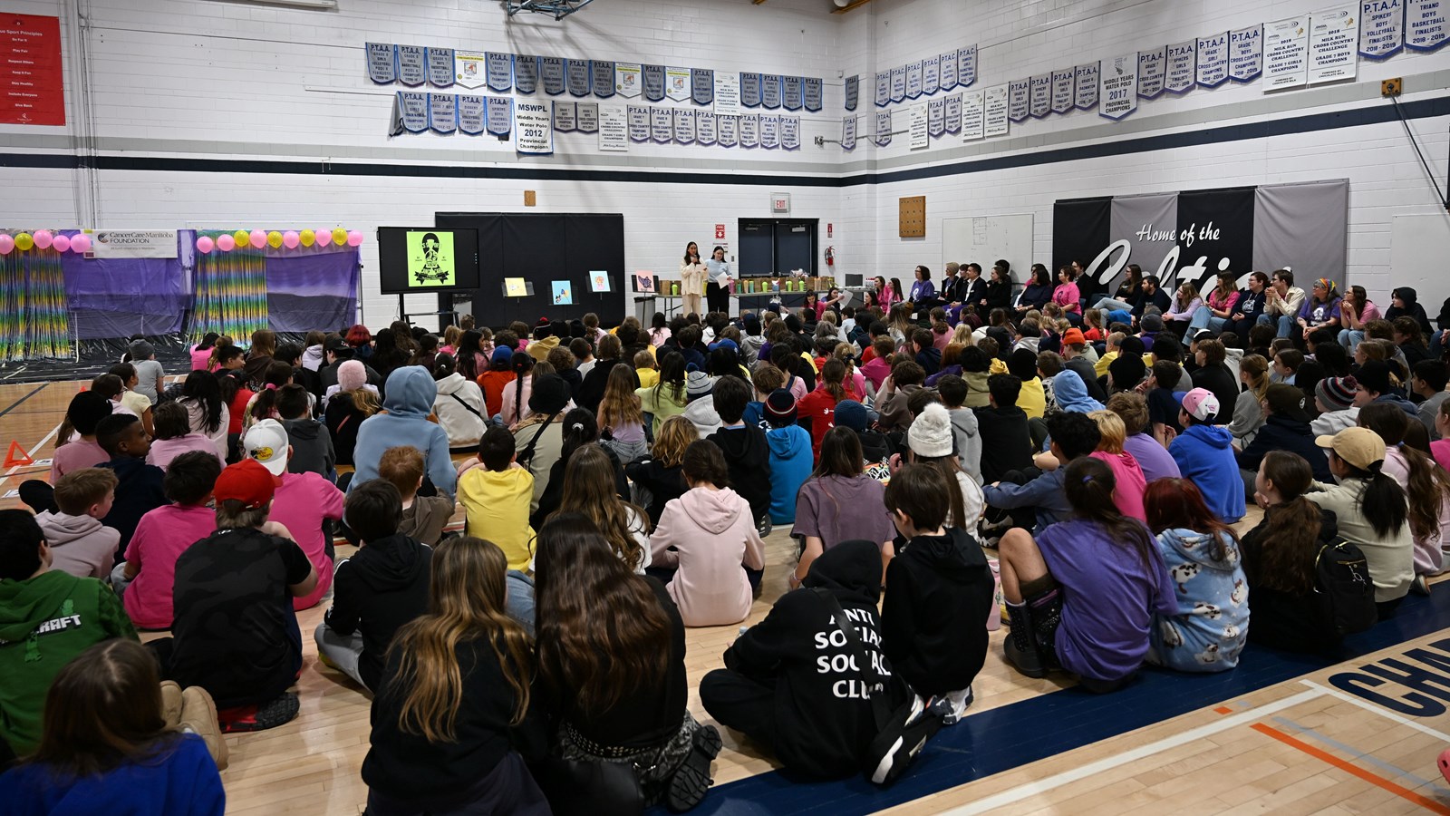 On Friday, March 27, students and staff gathered to celebrate the milestone. Former students and founders of the original CancerCare campaign, Paige Michalyshen and Christy Porritt, were on hand, along with Sharon Loewen, Manager of Development at CancerCare Manitoba, who shared a research update and accepted the commemorative cheque.